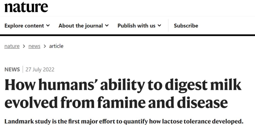 发表在《自然》杂志上的一项研究中,研究人员将欧洲早在9000年前就使用牛奶的考古证据与遗传学进行了比较,发现欧洲人在开始饮用牛奶后,就出现了异常迅速的乳糖耐受性进化。