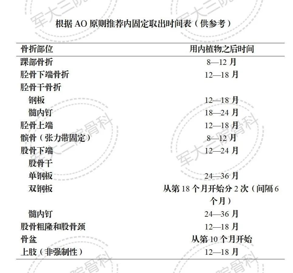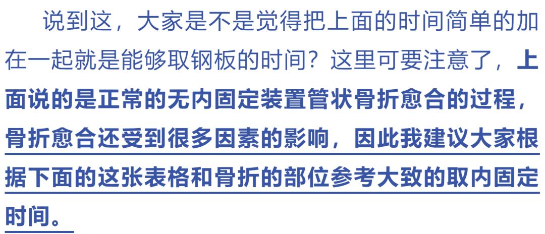 ③骨折愈合受多方面因素的影响,如年龄、骨质疏松、激素、全身营养、吸烟、局部血供、局部损伤程度等,因此本文中的内固定愈合时间表仅供参考,具体取出内固定的时间可根据表格内时间的前后节点,咨询骨科医生根据医嘱决定取内固定的时间。