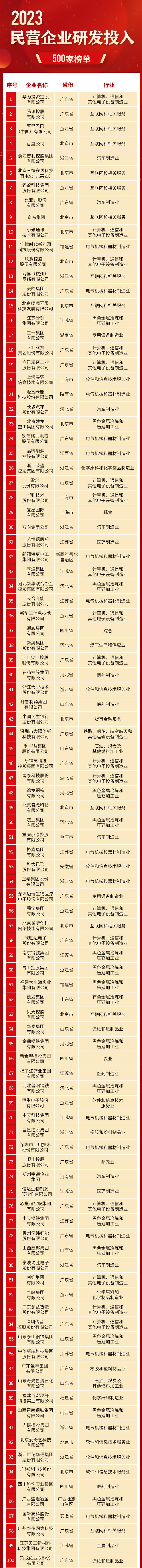 2023民营企业研发投入500强榜单