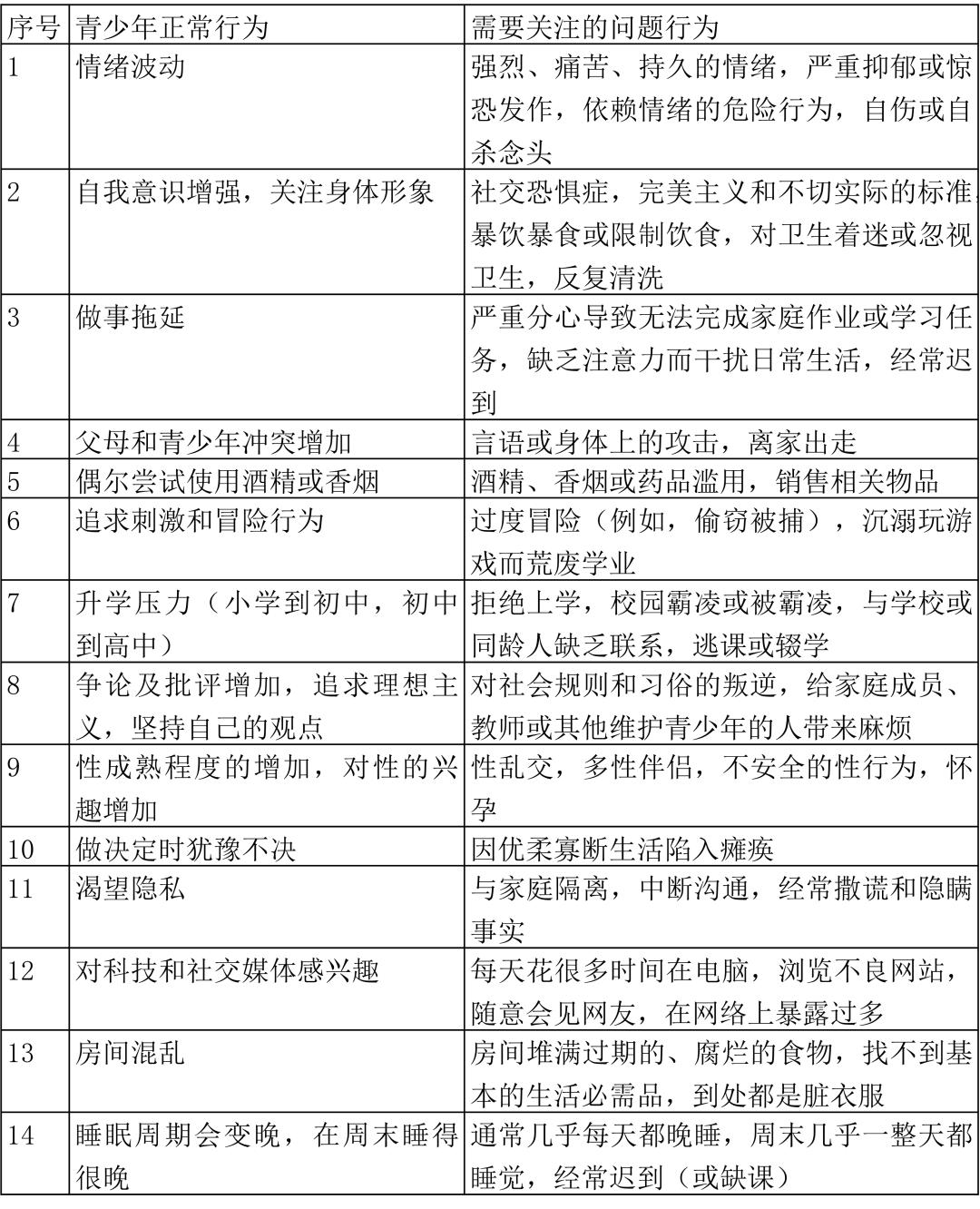 下面表格罗列了常见的青少年正常行为和问题行为。