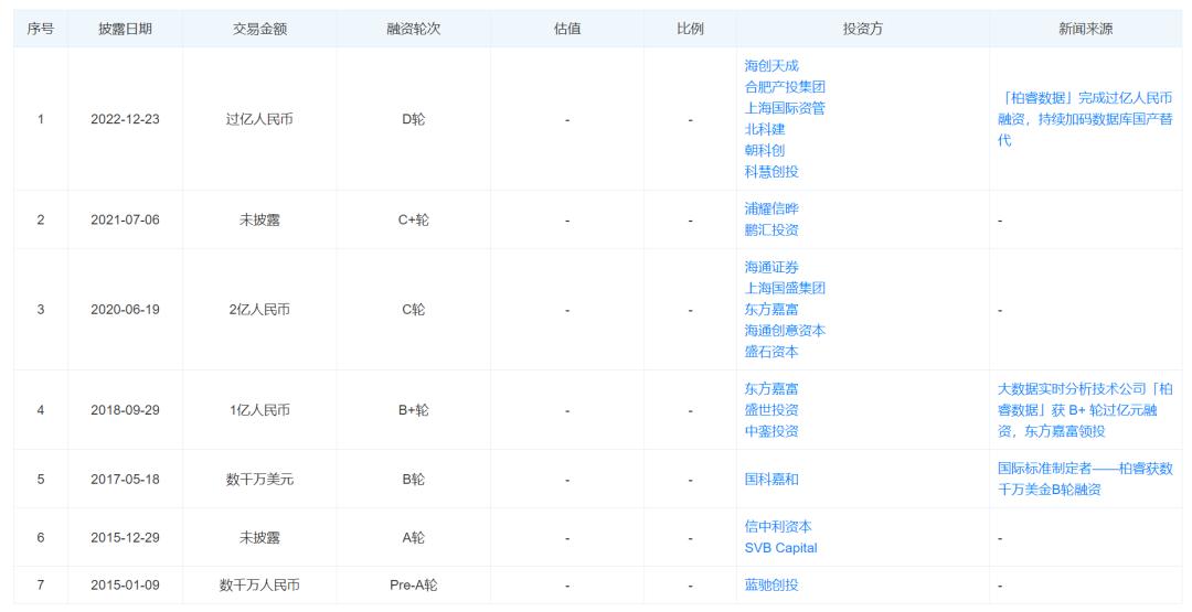 来源:天眼查从历次融资中发现,柏睿数据股东中有蓝驰创投、信中利、浦发硅谷银行、东方嘉富、国科嘉和、中金投资、合肥产投等知名机构。
