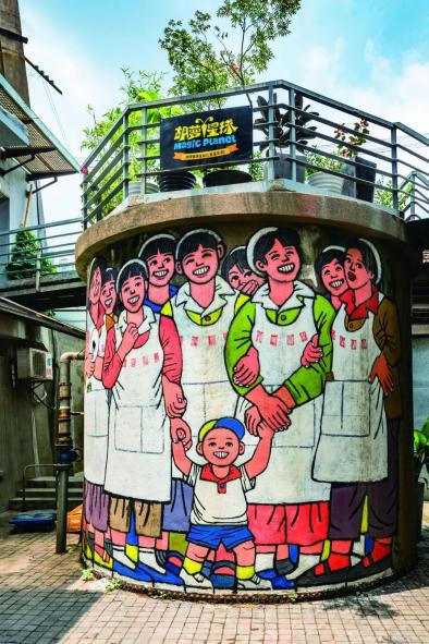 以春明粗纺厂昔日大铁门作为绘画基础的作品《搪瓷杯》园区内6号楼后的一座水塔已有长达半个世纪的历史,在低水塔的5米×4米圆弧形外立墙面上,用涂鸦的形式展现了9名戴着白色帽子穿着白色围裙的纺织女工,画面正前方站着高举双手牵着左右两位纺织女工手的活泼可爱的孩子,他们对着来往路人开心地咧嘴笑着,仿佛听得见朗朗的笑声。通过墙绘,工业遗存与它过去的文脉有了呼应,又因为园区当代艺术的氛围,显得独特又贴切。