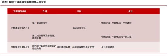 国内拥有第一类卫星通信业务牌照的仅有中国卫通、中国电信和中国交通通信信息中心;其中第一类基础电信业务中卫星通信业务主要包括卫星固定业务、卫星移动业务。