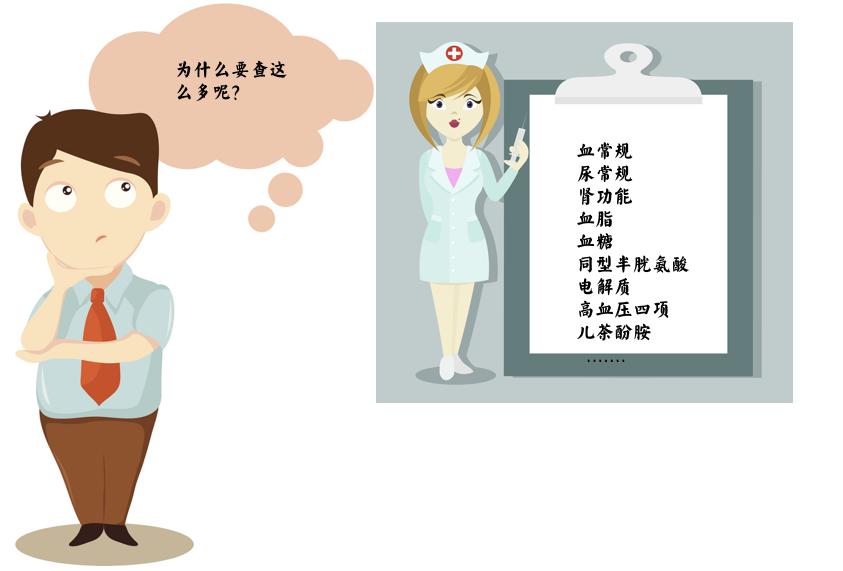 为什么要做这些检查?原发性高血压血常规一般无异常,但急进型高血压时,可有Coombs试验阴性的微血管病性溶血性贫血,伴畸形红细胞;尿常规及肾功能检查可明确高血压是否由肾脏疾病引,另外肾脏作为高血压损伤靶器官之一,监测其是否受损以及受损程度也是非常有必要的;血压、血脂、血糖虽然是三个相对独立的指标,但是三者的增高经常共同存在,即一种代谢综合症的状况。
