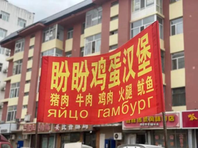 很多早市的摊贩立起中俄双语招牌