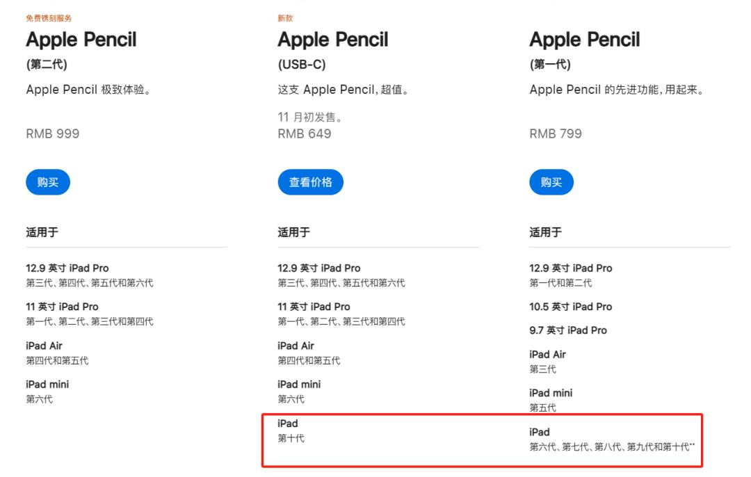 因为从适用类型来看,二代的 Apple Pencil 并不支持 iPad 10,一代可以适配,但充电需要转接。
