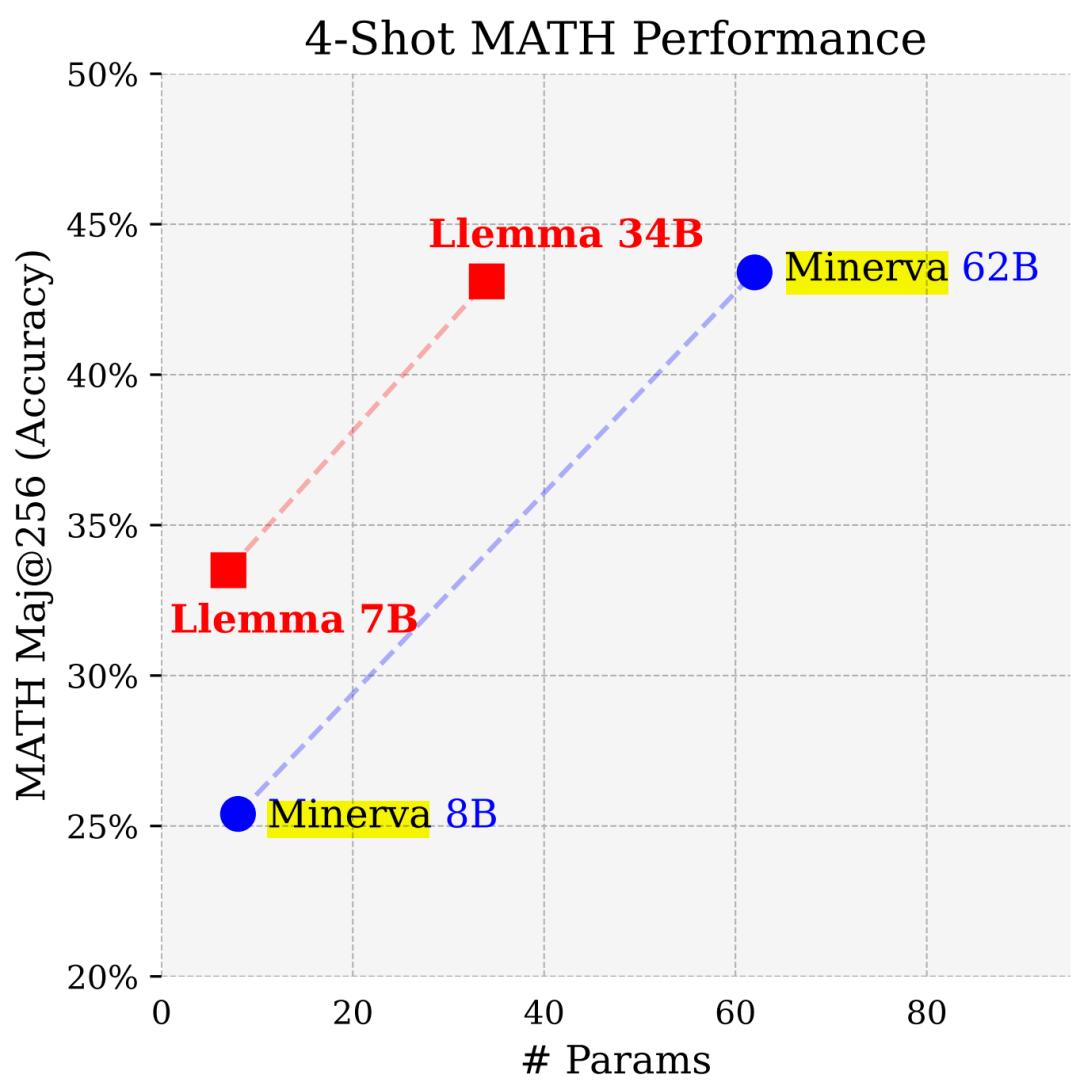 LLEMMA 7B 的 4-shot Math 性能远超谷歌 Minerva 8B,LLEMMA 34B 在参数少近一半的情况下性能逼近 Minerva 62B。