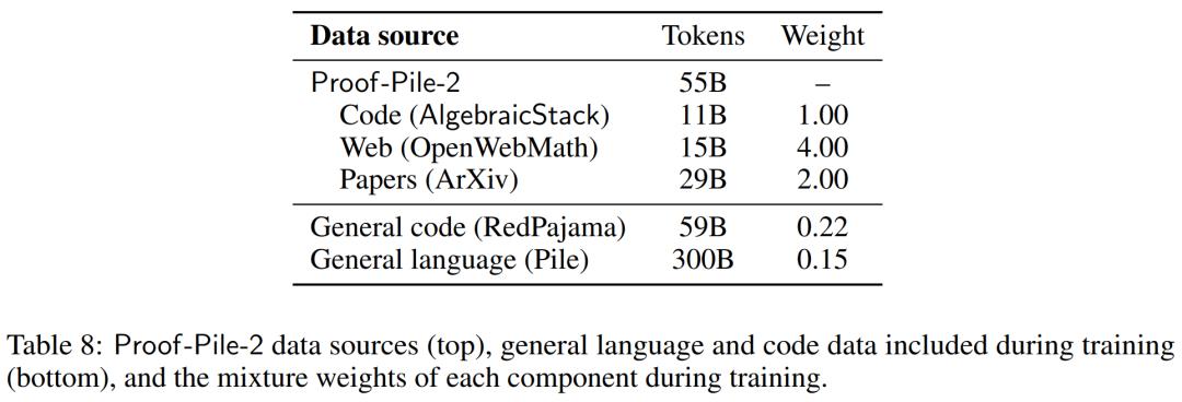 研究者创建了 Proof-Pile-2,这是一个 55B token 的科学论文、包含数学的网络数据和数学代码的混合物。除了 Lean proofsteps 子集之外,Proof-Pile-2 的知识截止日期为 2023 年 4 月。