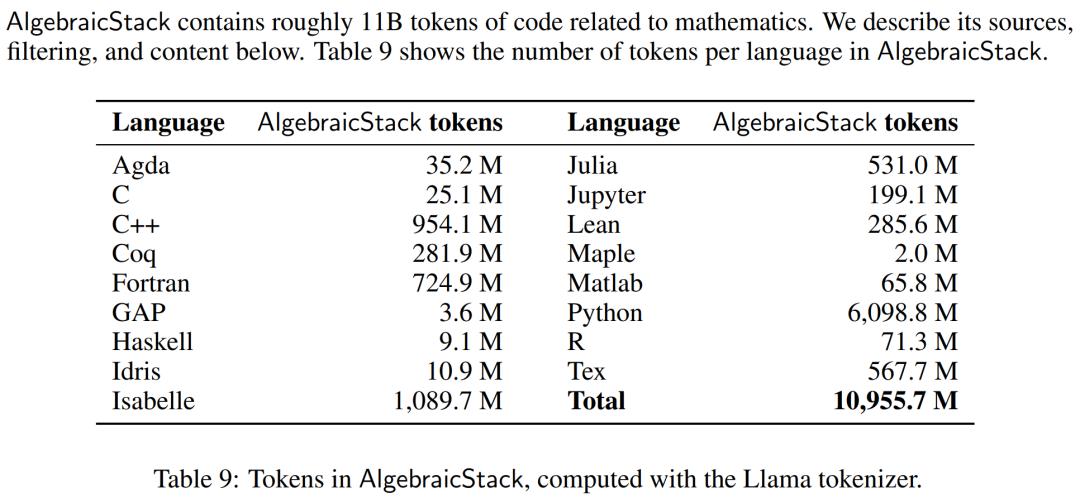 数值模拟、计算机代数系统和形式定理证明器等计算工具对数学家的重要性与日俱增。因此,研究者创建了代数堆栈(AlgebraicStack),这是一个包含 17 种语言源代码的 11B token 数据集,涵盖数值数学、符号数学和形式数学。该数据集由来自 Stack、GitHub 公共资源库和形式证明步骤数据的过滤代码组成。表9显示了AlgebraicStack 中各语言的 token 数量。