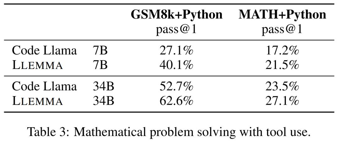 结果如下表 3 所示,LLEMMA 在这两项任务上均优于 Code Llama。同时使用工具后在 MATH 和 GSM8k 上的性能也优于没有工具的情况。