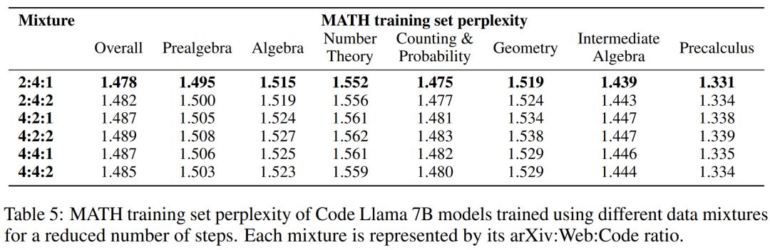 下表 5 显示了使用 arXiv、web 和代码等不同数据混合训练后,模型的 MATH 训练集困惑度。