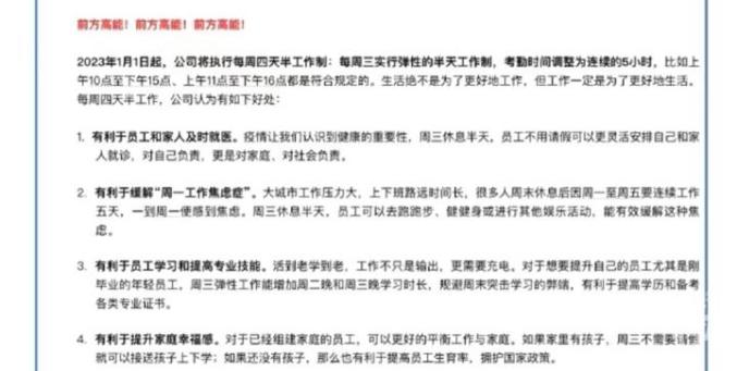 原标题:《实行4天工作制!明年1月8日开始执行!知名巨头宣布》