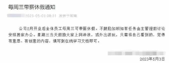 与其五天摸鱼,不如四天好好干。2023年4月,湖南长沙一传媒公司在其官方公众号发布消息称,全体员工每周三可带薪休假一天,鼓励公司员工每周三上网或外出游玩,且不提倡加班。