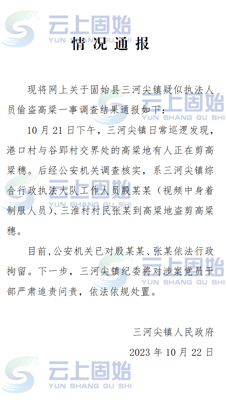 河南固始通报“执法人员带人偷高粱”:两人被行拘,严肃问责