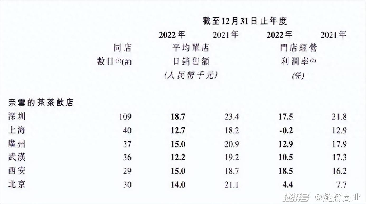 虽然官方预期不错,但结合奈雪的茶财报来看,其2021年、2022年每笔订单平均销售额分别为41.6元、34.3元,每间门店平均每日订单量分别为416.7单、348.2单;2021年、2022年门店经营利润为5.9亿元、4.7亿元,门店经营利润率为20.6%、11.8%。