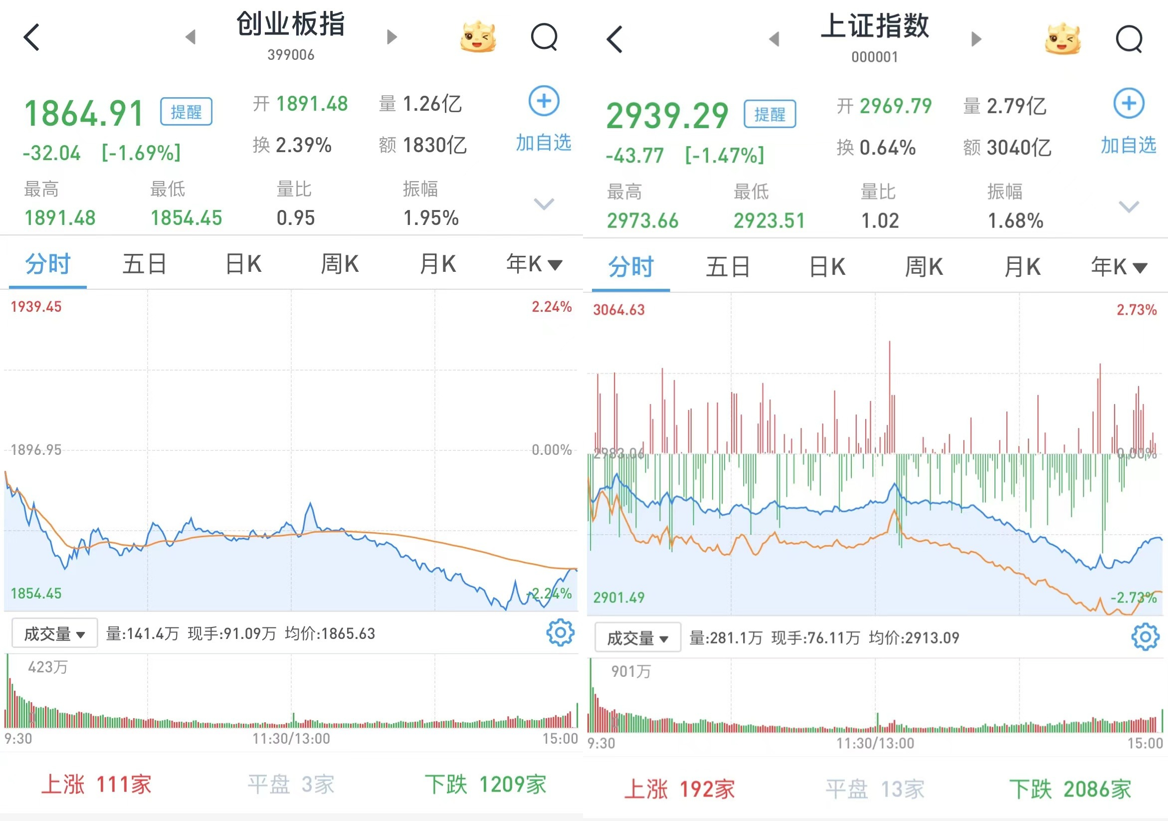 A股市场下行:沪指跌1.47%,深成指跌1.51%,创指跌1.69%