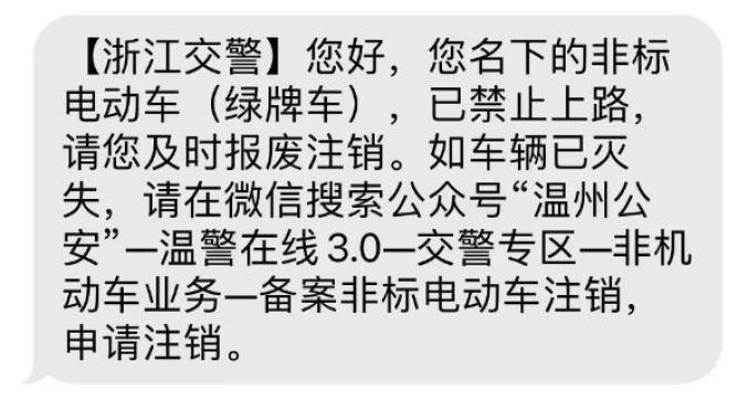 为方便群众办理灭失注销手续,温州公安交警部门推出了“线上灭失车注销申请”事项,群众可以通过微信小程序“温警在线”进行线上申请车辆注销。与此同时,交警部门会陆续给“绿牌”电动车车主推送车辆灭失注销在线申请的提醒短信。