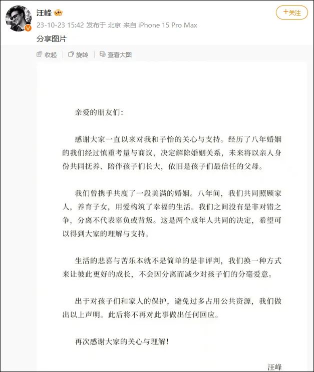 10月23日,汪峰、章子怡同时在微博发文称,“经历了八年婚姻的我们经过慎重考量与商议,决定解除婚姻关系,未来将以亲人身份共同抚养、陪伴孩子们长大,依旧是孩子们最信任的父母。”