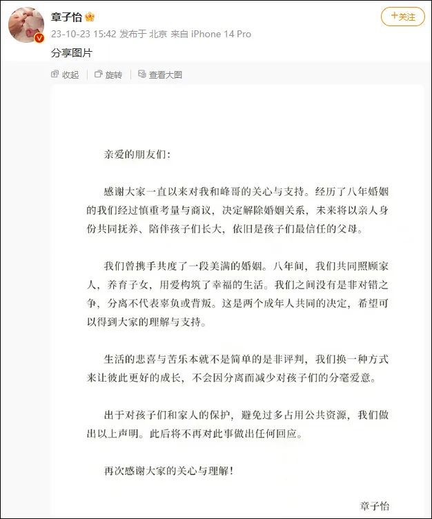 “我们曾携手共度了一段美满的婚姻。八年间,我们共同照顾家人,养育子女,用爱构筑了幸福的生活。我们之间没有是非对错之争,分离不代表辜负或背叛。这是两个成年人共同的决定,希望可以得到大家的理解与支持。生活的悲喜与苦乐本就不是简单的是非评判,我们换一种方式来让彼此更好的成长,不会因分离而减少对孩子们的分毫爱意。”