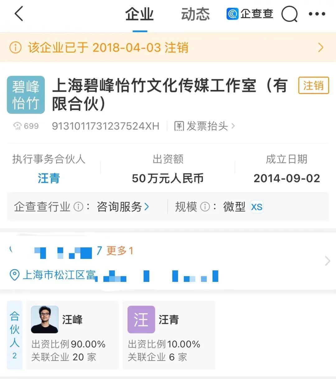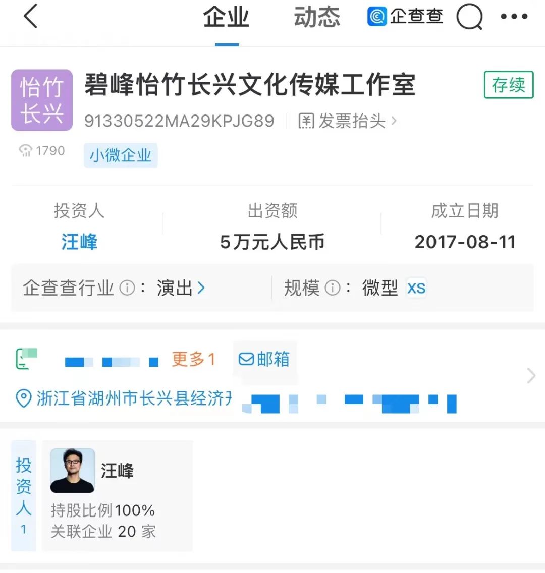 2014年,汪峰和章子怡共同成立了山竹(北京)文化传媒有限公司,目前,该公司为存续状态,法定代表人、执行董事、经理为汪峰,监事为章子怡,两人各持股50%。企查查APP显示,汪峰关联企业达20家,12家为存续状态。值得一提的是,其名下的碧峰怡竹长兴文化传媒工作室与上海碧峰怡竹文化传媒工作室(有限合伙)带上了章子怡的“怡”字。其中上海碧峰怡竹文化传媒工作室(有限合伙)已于2018年4月注销,碧峰怡竹长兴文化传媒工作室现为存续状态。