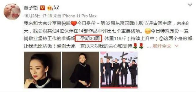 2019年10月28日,章子怡本人在社媒账号中晒出自己的孕肚照,并发文承认怀二胎一事,而且坦言已经有30周的孕期。