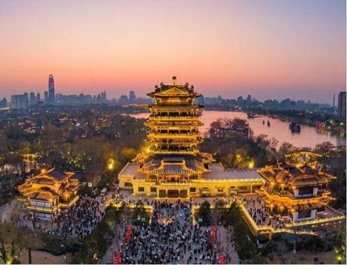 大明湖的超然楼始建于元代,明代的蔡叆想必应该见过超然楼“原楼”吧,如果他重阳节时穿越回现在的济南,见到重建的超然楼——7层、高50多米,坐落在宽大的汉白玉基上,顶覆铜瓦,气势宏伟,一定会非常震撼吧。超然楼2021年荣获中国历史文化名楼的称号,也被人称为"江北第一楼"。如今蔡叆重阳节游大明湖,登顶超然楼,可俯视整个大明湖的风景,不止能望见湖中小洲旁蒹葭苍苍,还能望见全国各地来“打卡”超然楼亮灯的游客、玲琅满目的市集,还有精彩绚丽的明湖灯光秀,美景尽收眼底,还被热闹包围着,想必再吟重阳诗时,秋悲也会被冲淡许多吧。