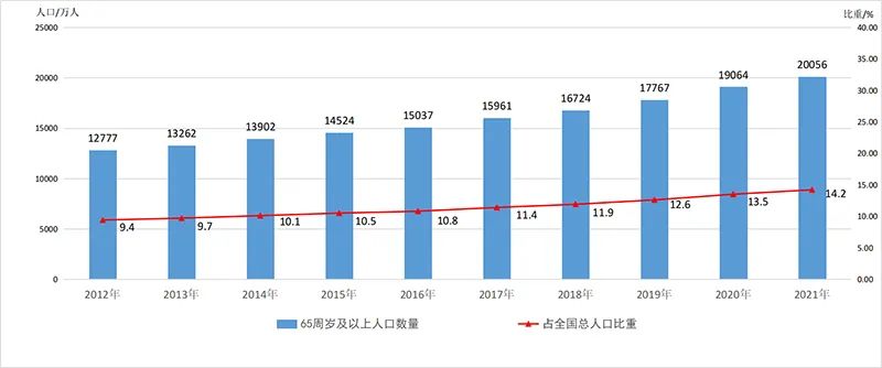 但是,我国老年人所占人口比例日渐加剧——国家卫健委数据显示,截至2021年底,我国65岁以上老年人口已达2亿以上,占总人口比重的14%。