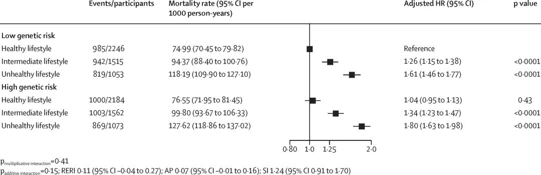 图1. 遗传风险和健康生活方式联合作用对全因死亡风险的影响高遗传风险组全因死亡的绝对风险降低程度更明显。高遗传风险组保持健康生活方式者的3年累积死亡绝对风险降低程度为7.28%(95%CI 5.72%–9.06%)(不健康生活方式者的3年累积死亡率:19.03%,95%CI 17.61%–20.44%;健康生活方式者的3年累积死亡率:11.75% ,95%CI 10.90%–12.60%)。低遗传风险组保持健康生活方式者的3年累积死亡绝对风险降低程度为5.51%(95%CI 4.03%–7.28%)。
