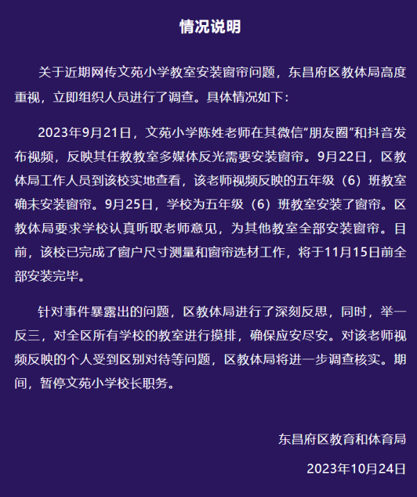 此事被媒体曝光之后,10月24日下午,东昌府区教育和体育局做出情况说明,陈老师反映的问题属实,区教体局要求学校为所有教室安装窗帘。而且,区教体局还将对陈老师受到区别对待等问题做进一步调查核实。期间,暂停文苑小学校长职务。