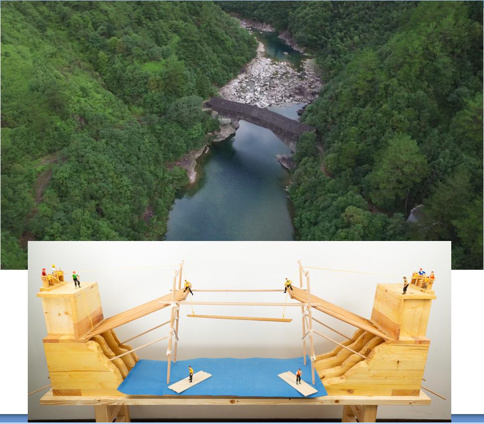 闽浙木拱桥群像(图片来自刘妍“有方”讲座)二〇二一年,新一代建筑史学者刘妍的《编木拱桥——技术与社会史》(以下简称《编木拱》,文中引文凡未注出处者,皆引于此)一书出版。这位留学德国的年轻学者没有像常规的技术史写作那样,直接从传世文物和图像资料出发进行类型学分析,而是通过复原古罗马现实场景下的实际需求和技术条件,对恺撒在《高卢战记》中以文字形式记载的莱茵桥进行推测和复原,弥合文字与图像实物的分离、炫耀性的征服记录与实用中的技术知识的分离,厘清了中世纪以来研究恺撒建造学的误解,指出恺撒的莱茵桥正是一种编木拱桥。更进一步,刘妍回到中国的闽浙山区,考察在真正的生产生活中持续使用至今的中国木拱桥。除了完成对大量文字和图像资料的爬梳工作,她还在山涧之间、急流之上,实地测绘了一座又一座古代和现代用相同技术建造的编木拱桥;在工作室内完成了建筑专业学生拿手的模型制作;更带着人类学者的眼界和历史学者的深思,深入当地社会生活的历史与现实,不止一次地全程参与造桥匠人的实际营造工作。她得以完成这样一部从外部和内部,从历史和当下的各个立足点出发,深入探究“编木拱桥这个不断闪现在人类历史的各个时间、不同角落的奇特、罕见现象”的“特殊的技术史与社会史”。