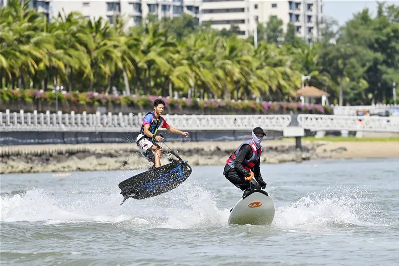 2023海口杯帆船赛期间,电动冲浪板表演吸引游客参与体验。记者 石中华 摄海口市旅游和文化广电体育局相关负责人: