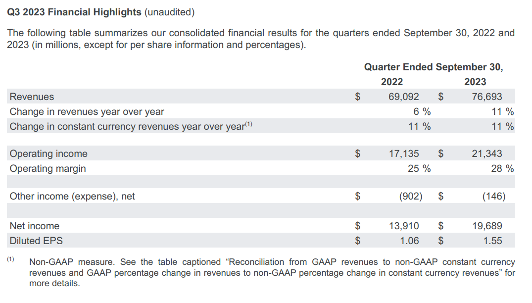 搜索引擎巨头谷歌母公司Alphabet(Nasdaq:GOOGL)三季度整体表现优异,却因谷歌云表现不及预期造成投资者担忧。当地时间10月24日,谷歌母公司Alphabet发布了截至2023年9月30日的2023年第三季度财报。财报显示,Alphabet第三季度实现营收766.93亿美元,高于757.30亿美元的市场预期,去年同期为690.92亿美元,同比增长11%;净利润196.89亿美元,去年同期为139.10亿美元,同比增长42%;每股收益为1.55美元,高于1.449美元的市场预期,去年同期为1.06美元。