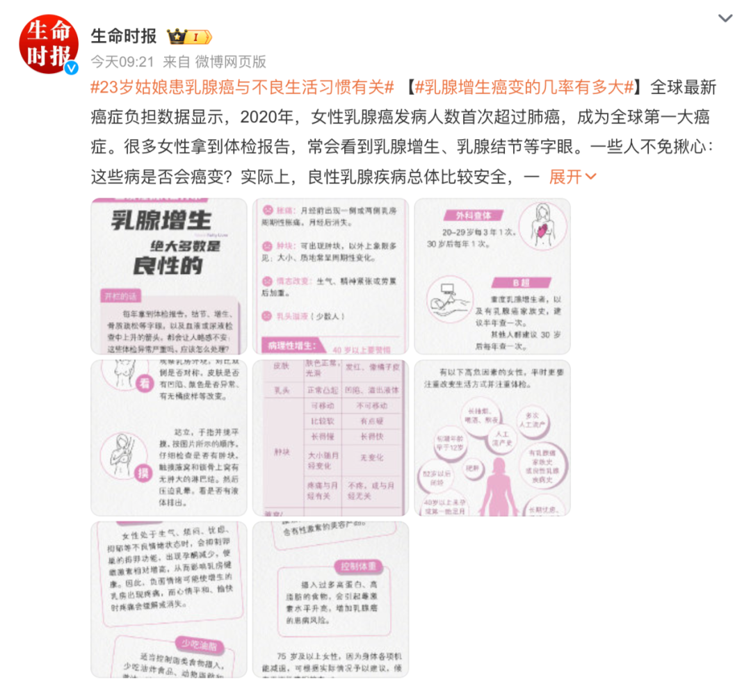 这两天,一条“23 岁姑娘患乳腺癌”的帖子登上微博热搜,引起了许多网友的关注和担忧。文章报道了一位年轻女性在一年多前体检发现右侧乳房有个 1cm 大小的肿块,当时考虑是纤维腺瘤,结果一年时间发现肿块增大,再去医院检查时竟然是乳腺癌。