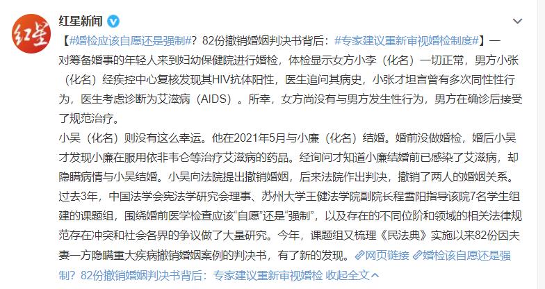如果有传染病,比如像乙肝、梅毒、艾滋等等,在婚检时查出来,对双方都有好处。像文章开头的病例那样,明知道自己有艾滋病还要与别人结婚,就存在隐瞒重大疾病的情况,是可以撤销婚姻的。问题是,如果没有及时发现另一半有传染病而被传染了,可以说是无妄之灾了。从这方面来讲,婚检也是给自己的健康增加了一份保险。