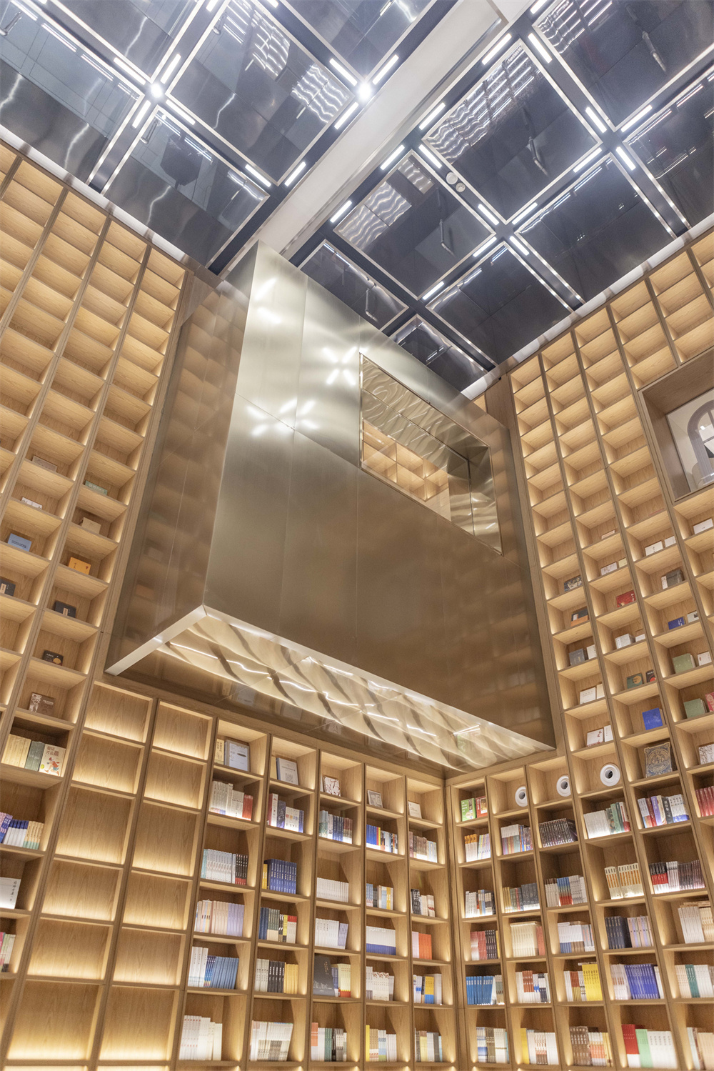 中庭的“黄金屋”取“书中自有黄金屋”之义,陈列以当代文学作品为主。这是三个采光中庭的其中之一,二楼、四楼、六楼分别有三个垂直的中庭,这些区域会用作筹办活动的文化主题小广场。