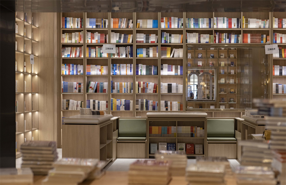 当街道沿着自动扶梯盘桓而上的时候,书架就成为了城市的界面,在每一层营造了不同的城市空间。从中华书局到开明书局,读者可以看到关于福州路的历史印记,在每一个城市书架界面的背后感受到欣欣向荣的城市生活。