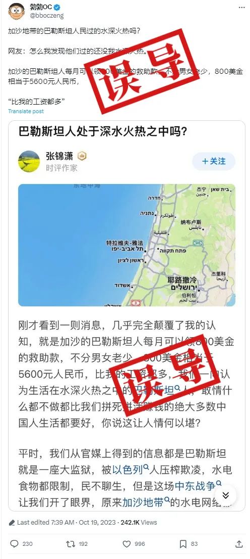 明查|加沙的巴勒斯坦人每人每月能领取800美元?
