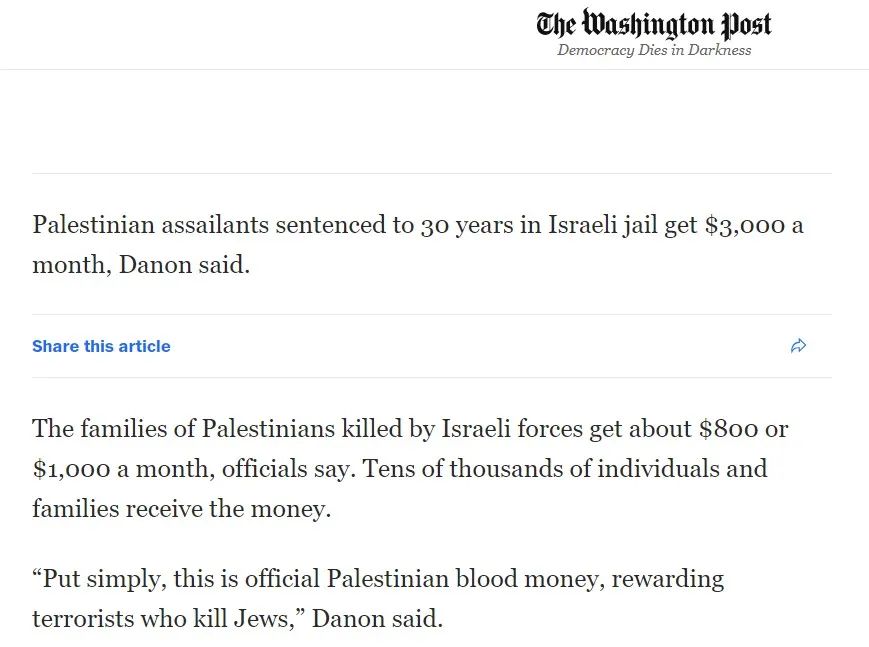 2017年,据《华盛顿邮报》5月21日报道,当时的以色列驻联合国大使Danny Danon曾呼吁美国、欧洲和其他国家切断与巴勒斯坦人的联系。他表示,“捐助国每年向巴勒斯坦权力机构提供的援助最终都资助了杀害无辜以色列人的恐怖分子。”“以色列军队杀死的巴勒斯坦人的家人每月可获得约800至1000美元,数以万计的个人和家庭收到了这笔钱。”