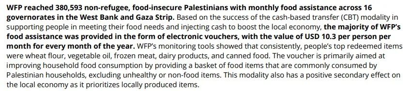 联合国近东巴勒斯坦难民救济工程处(UNRWA)2022年的报告指出,在2022年的紧急援助计划下,提供粮食仍然是近东救济工程处在加沙的优先事项。“工程处解决了114.3688万名弱势巴勒斯坦难民的紧急粮食和营养需求,并向1.4575万人分发现金援助……还向2.2044万名赤贫巴勒斯坦难民提供了紧急现金援助。”