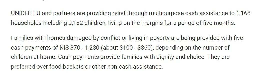 此外,联合国儿童基金会今年1月份的报告也提到,联合国儿童基金会、欧盟及其合作伙伴正在通过多用途的现金援助向(加沙地区)1168个家庭提供救济,其中包括9182名儿童,为期五个月。房屋因冲突受损或生活贫困的家庭将获得五笔现金,金额为370-1230新谢克尔(约合人民币666-2214元),具体金额取决于家中儿童的数量。