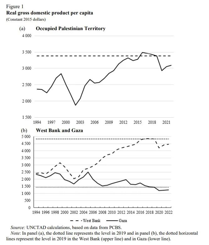 按照联合国贸易和发展会议(UNCTAD)2022年发布的报告,新冠疫情过后,加沙实际GDP虽然增长5.6%,但仍比2019年低11.7%,接近1994年以来的最低水平。
