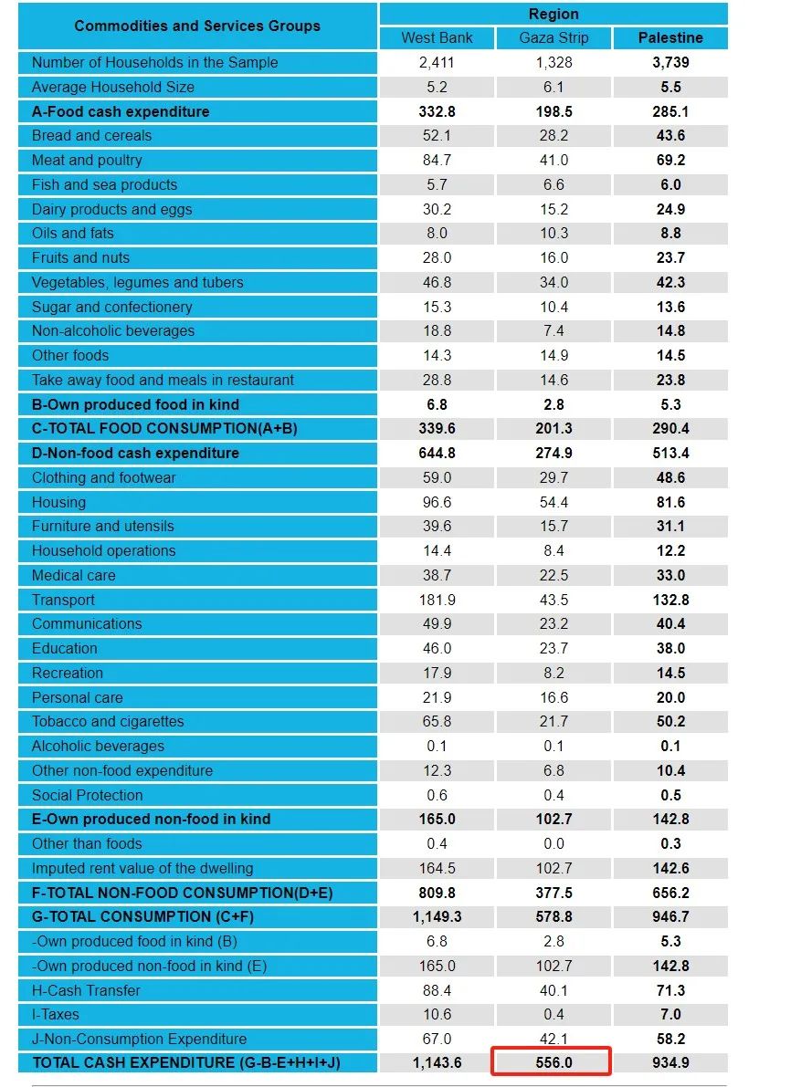 按照巴勒斯坦中央统计局(PCBS)的数据,2023年第二季度,巴勒斯坦国内生产总值(GDP)约为47亿美元,国民总收入(GNI)约为57亿美元,人均国内生产总值约为917.2美元。细分到加沙地区,2017年,平均每个家庭每月现金消费总额仅为556新谢克尔(约合人民币1000.9元)。2020年,巴勒斯坦15岁及以上雇员的工资仅为61.6新谢克尔(约合人民币110.9元)。