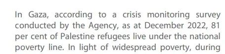 联合国近东巴勒斯坦难民救济工程处指出,在加沙,截至2022年12月,81%的巴勒斯坦难民生活在国家贫困线以下。