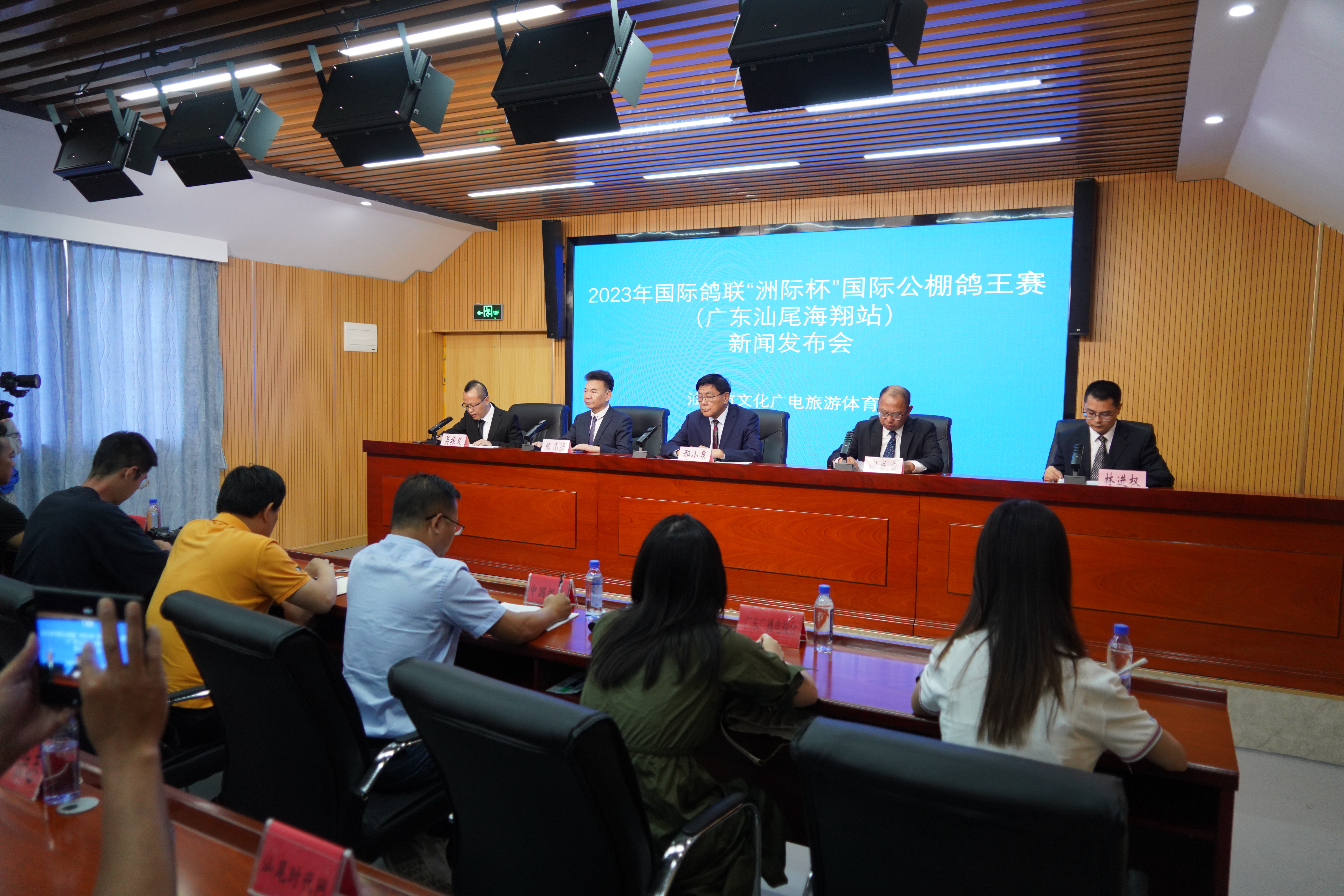 10月27日,汕尾市召开2023年国际鸽联“洲际杯”国际公棚鸽王赛(广东汕尾海翔站)新闻发布会,通报赛事基本情况。市文化广电旅游体育局局长谢威宣主持会议,中国信鸽协会会长邢小泉,广东省信鸽协会会长陈伟强,市文化广电旅游体育局副局长林进权,广东海翔赛鸽有限公司总经理吴振义出席会议。