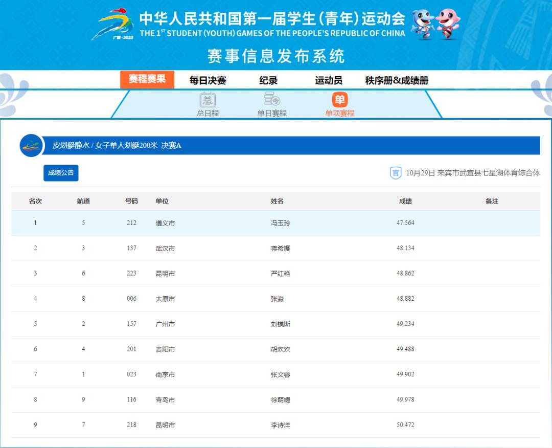 10月29日上午,第一届全国学生(青年)运动会皮划艇静水比赛迎来首个决赛日,共产生4枚金牌。在首场进行的女子单人划艇200米决赛中,遵义市代表队运动员冯玉玲以47秒564成绩夺得金牌,同时也是本届学青会皮划艇静水比赛项目首金。