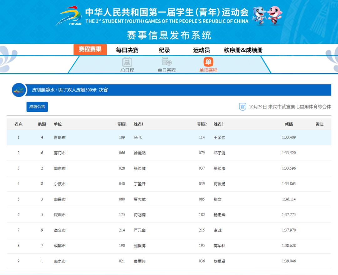 (官方截图)青岛市代表队的马飞、王金伟以1分33秒