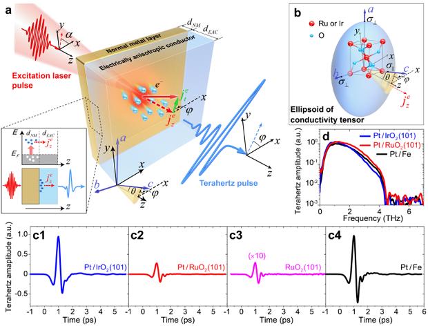 近日,物理学系吴义政、陶镇生课题组合作系统研究了RuO2和IrO2-金属异质结器件的太赫兹发射特性,揭示了一种全新的非相对论、非磁性的太赫兹产生机制。相关成果以“Nonrelativistic and nonmagnetic terahertz-wave generation via ultrafast current control in anisotropic conductive heterostructures”为题发表在Advanced Photonics上。新闻链接: