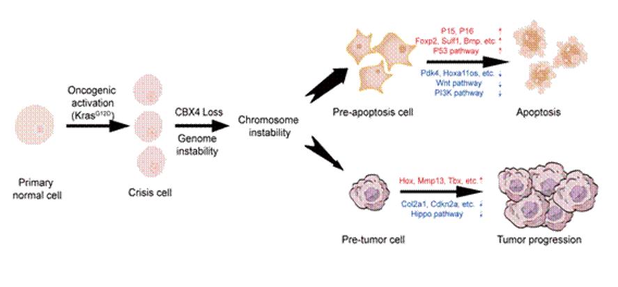 9月12日,基础医学院人体解剖与组织胚胎学系王作云和梁春敏课题组于Signal Transduction and Targeted Therapy杂志在线发表了题为“CBX4 deletion promotes tumorigenesis under KrasG12D background by inducing genomic instability”的工作。该研究揭示了PRC1家族重要成员CBX4的缺失会影响基因组稳定性,并在KrasG12D突变背景下通过调节P15,P16等凋亡相关基因的表达,使大部分细胞在初始阶段凋亡,而存活细胞的多种肿瘤相关基因和Hippo等信号通路改变,最终诱导肿瘤产生的现象。该研究提供了低CBX4水平肺癌发生的可能机制,并为精准靶向具有KrasG12D突变的癌症治疗提供了新线索。新闻链接: