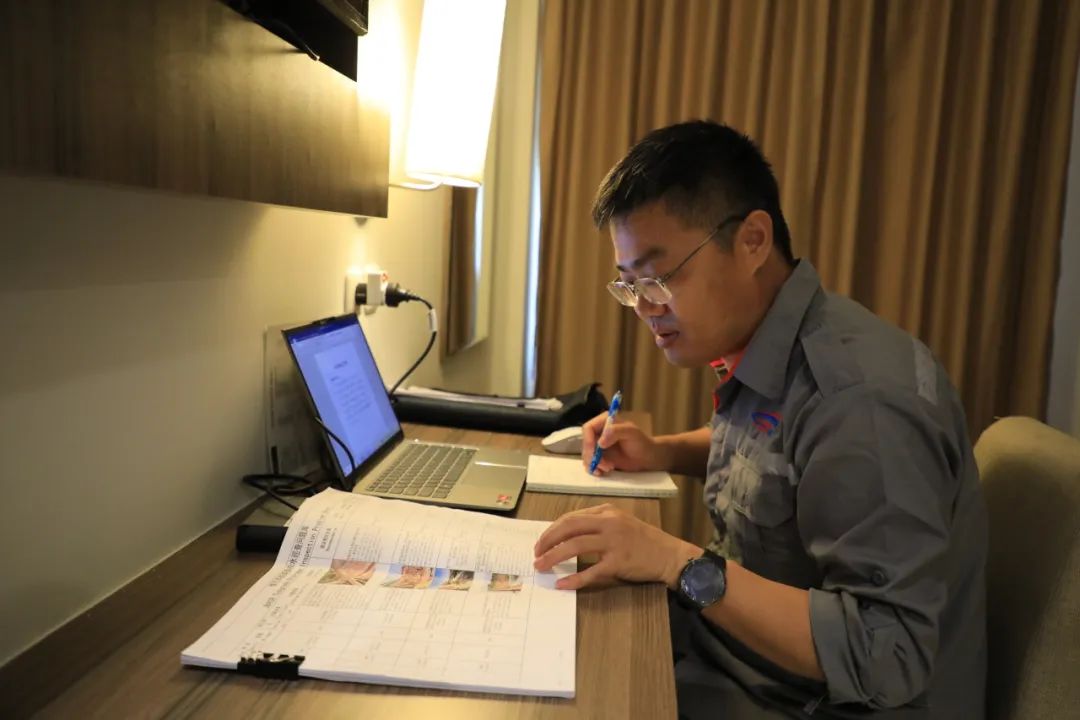 顶着烈日完成一天高强度的工作后,董昭阳还要利用晚上时间整理施工材料,制订次日施工计划。驻地条件简陋,有时晚上停电,空调用不了,忙碌一天的他只能在高温和蚊虫叮咬中睡去。
