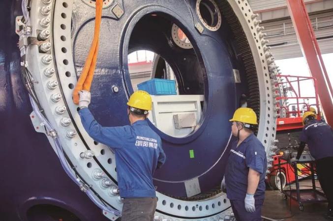 在明阳智能吉林长岭风电装备产业基地生产车间,记者看到,在先进设备的辅助下,工人有序地将零件组装到一起。据吉林明阳智慧能源有限公司总经理助理艾岩介绍,该项目按照目前陆上风机5.0及以上机型年产350台产能建设,可实现主机制造装配、工程备件管理及运营服务等多业务能力全覆盖。